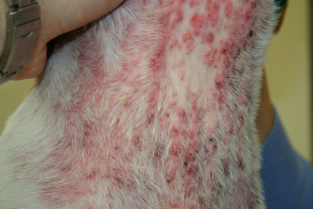 При генералізованій формі симптоми ті ж, але площа ураження значно більше. Пустули поширюються не тільки на морду і голову, але і на кінцівки, і на всі інші ділянки тіла. При цьому на вогнищах ураження випадає шерсть.
