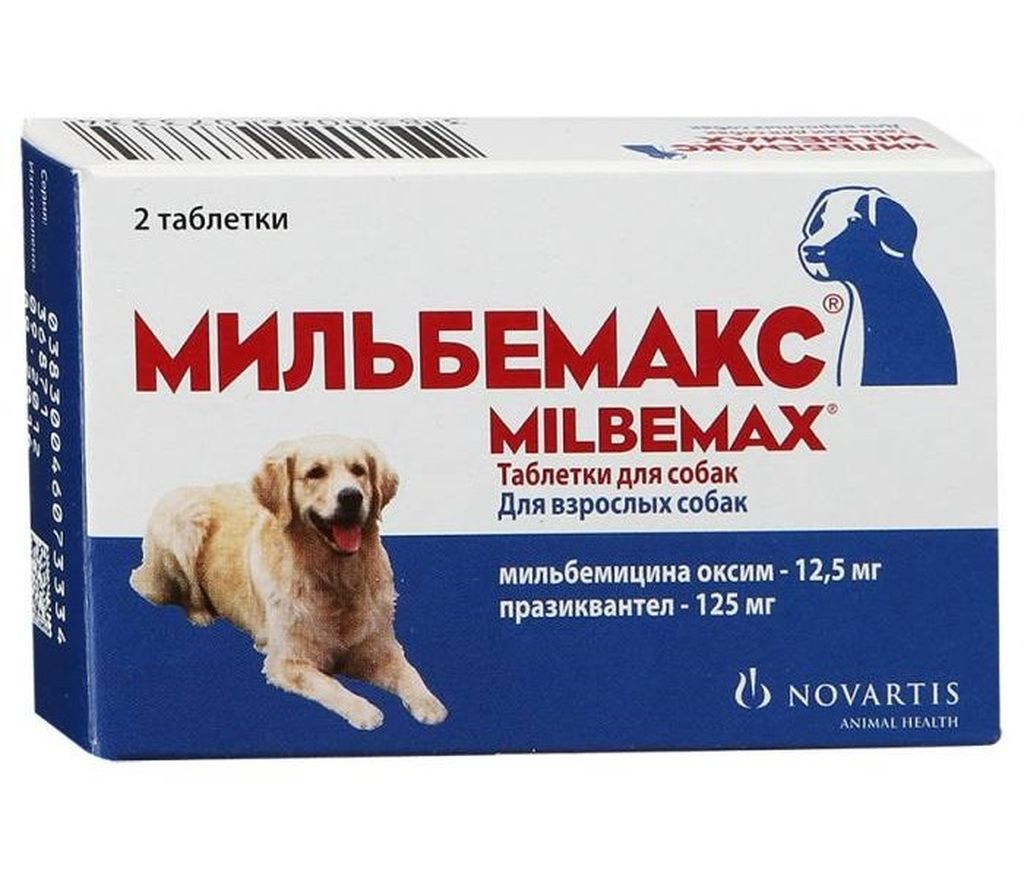 - Мильбемакс. Ефективний, але дорогий препарат у вигляді таблеток. Зручний для дегельмінтизації собачок невеликого розміру і цуценят. Діючі компоненти – мильбемицина оксим і празиквантел.