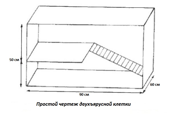 Алгоритм дій по створенню житла для карликового кролика розглянемо на прикладі двоповерхової клітини з наступними параметрами: довжина — 90 см, ширина — 60 см, висота — 50 див.