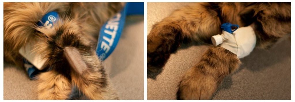 Зняти його нескладно: лейкопластир акуратно розрізають близько крилець, отлепляют від шерсті. На місце входу трубочки у вену накладають ватку з антисептиком, а катетер обережно витягають. На лапу накладають пов’язку зі стерильною серветкою на годину.