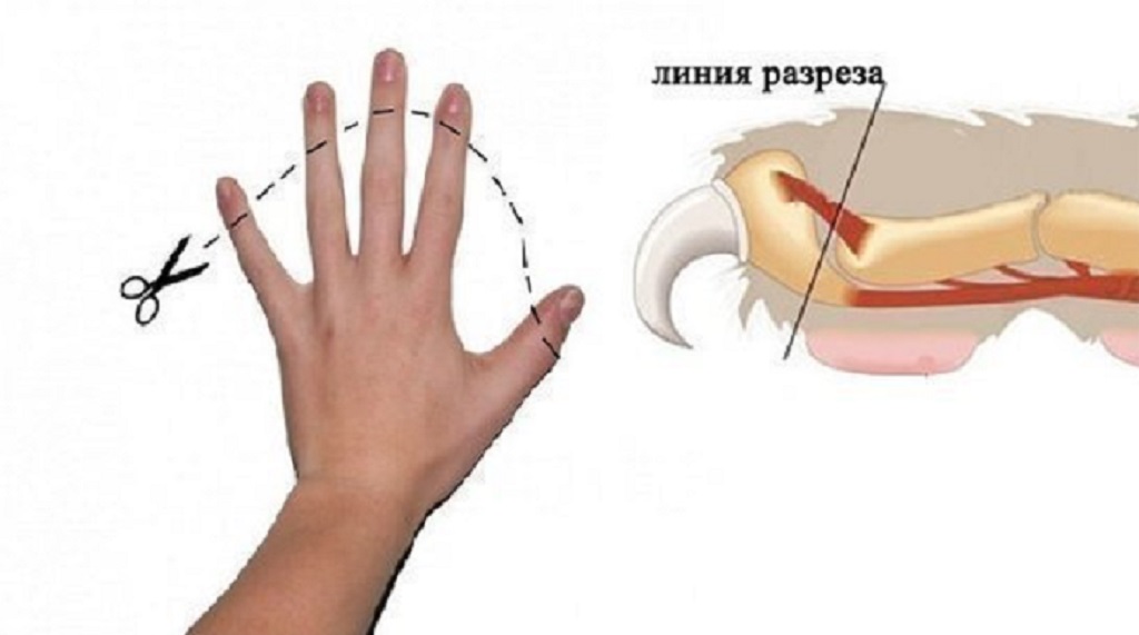 Видаляється не тільки кігтик, як припускають багато власників, а ціла фаланга (зовнішня частина пальця). Проведене дія супроводжується великою втратою крові.