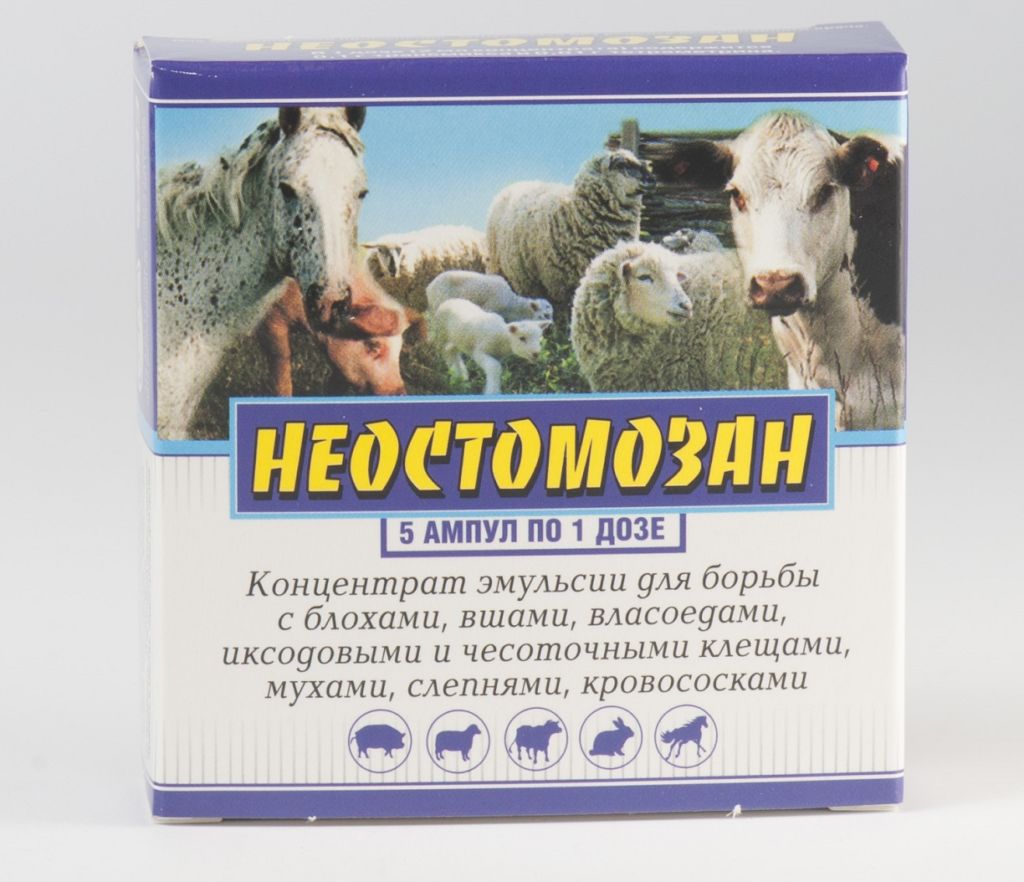 Неостомозан – безпечний профілактичний препарат широкого спектру дії. Використовується для боротьби з ектопаразитами (блохами, кліщами, власоедом та ін). Застосовується для обробки вихованців і приміщень, в яких утримується тварина.