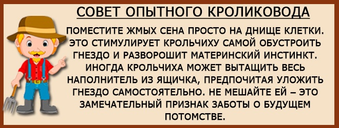 - треба встановити на 26 день вагітності, щоб самка могла до нього звикнути і облаштувати (насмикати пуху, скласти сіно по-своєму).