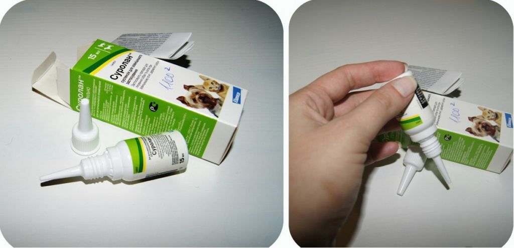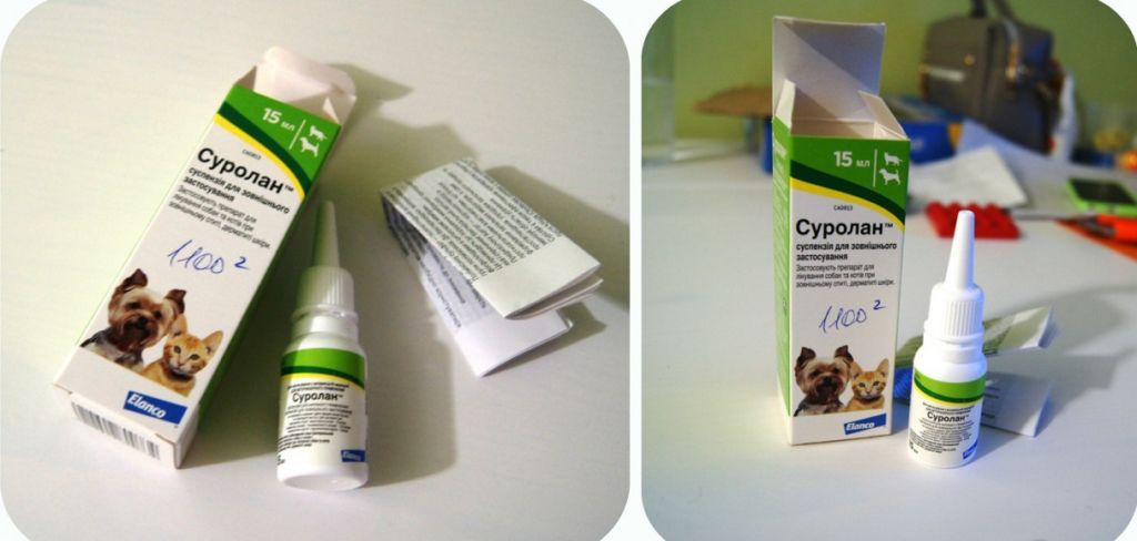 Препарат Суролан – ефективний, але досить дороге засіб від отиту та вушного кліща. Він має густу консистенцію, завдяки чому обволікає поверхню вушної раковини. Також препарат дозволений для лікування вагітних і годуючих собак.