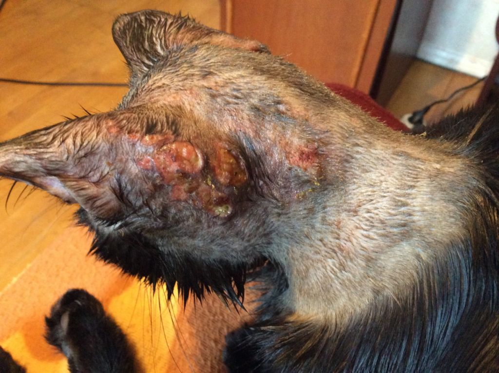 - Спочатку тварина починає люто свербіти, і це призводить до часткового облисіння, появі на шкірі маленьких подряпин і виразок.
