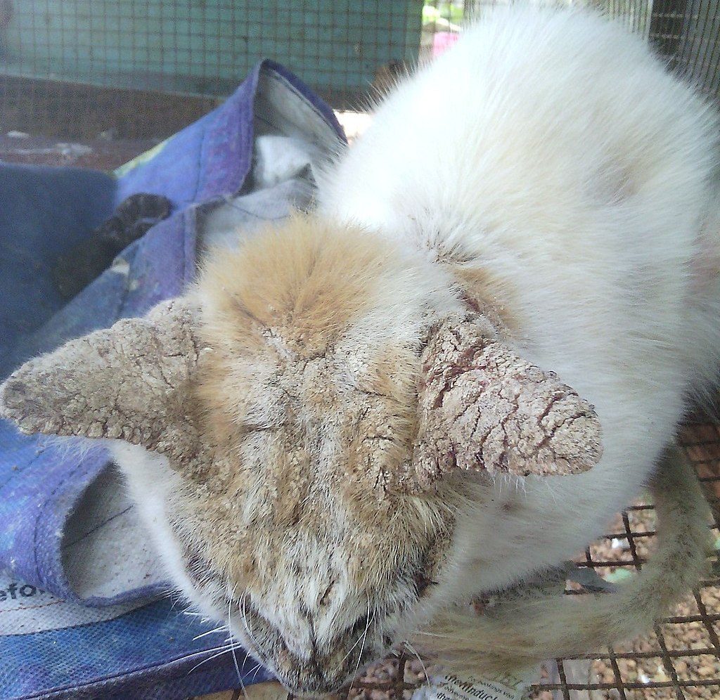 - На шкірі голови і вухах з’являються скоринки сірого або жовтого відтінку. Іноді їх можна виявити близько геніталій і на лапах кішки.