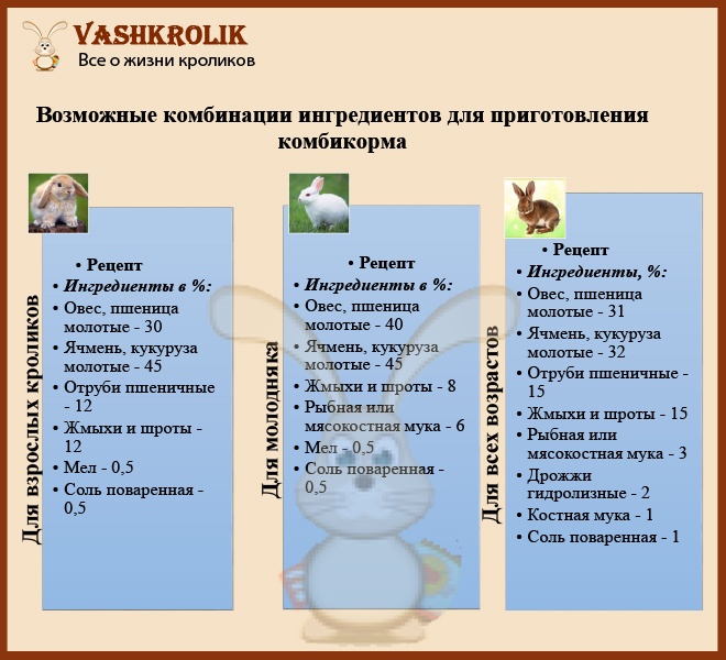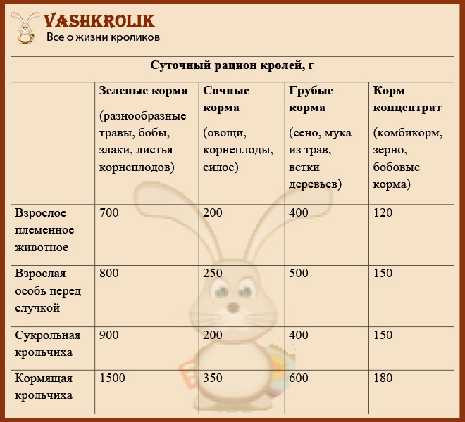 Не варто збільшувати наведену в таблиці норму — це призводить до ожиріння. Напувати кролів можна водопровідною водою за умови, що вона без запаху і сторонніх домішок. Воду в поїлках змінюють кожен день. Періодично рекомендується давати м’ясо-кісткове борошно, крейда, сіль. Годувати тварин слід регулярно і ситно, оскільки стрес від голодування гальмує розвиток кролів і погіршує здоров’я.
