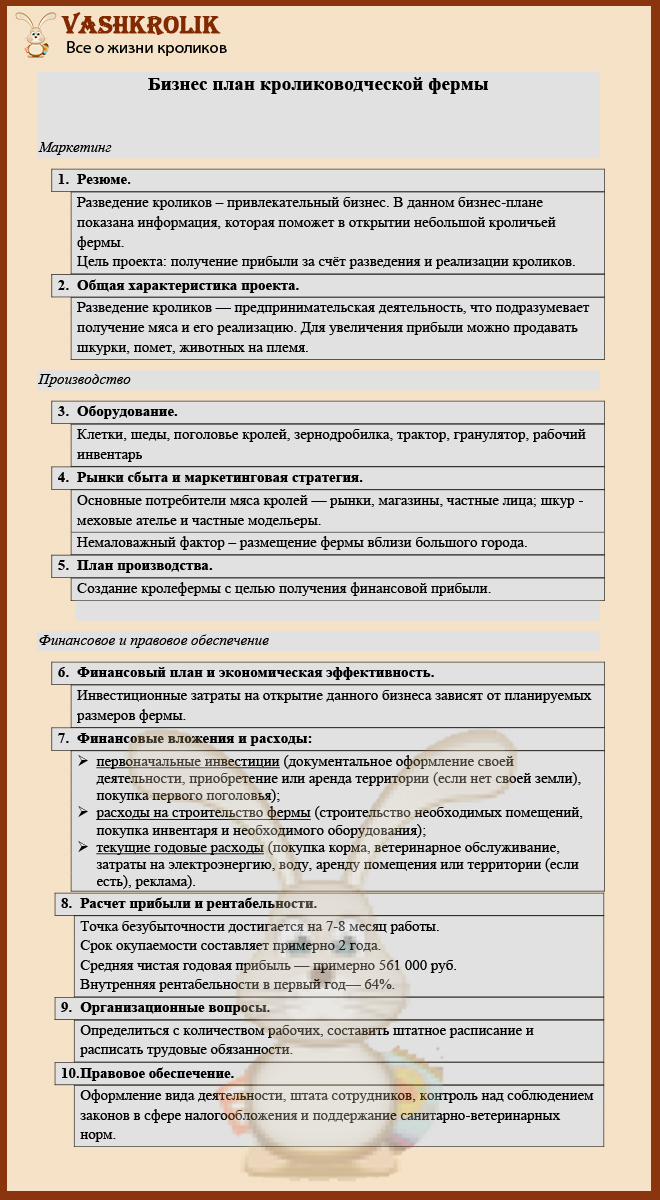 При створенні великої ферми і вирощуванні багатотисячного племені кролів треба ретельно прорахувати фінансову частину проекту, оцінити свої можливості, проаналізувати ситуацію на ринку — розробити повноцінний бізнес-план.
