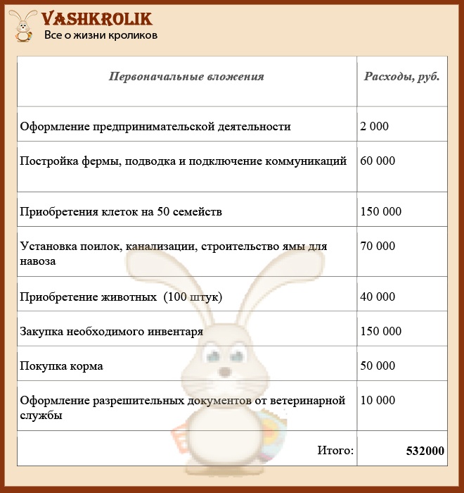 Найбільша частина витрат – це фінансові вкладення в початку. Багато грошей іде на документальне оформлення організації, купівлю або оренду ділянки, спорудження будинку. У ці витрати ще додають придбання обладнання, інвентарю, корми, а також племінних тварин на розмноження.