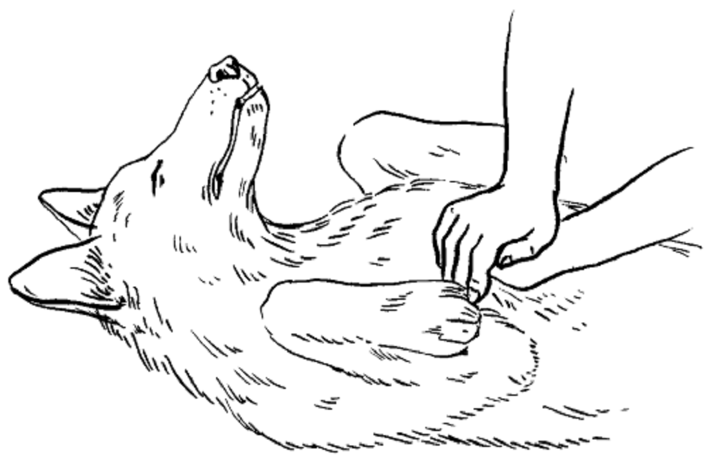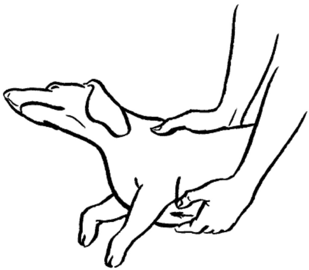 Таку собаку укладають на спину, при цьому голову опускають нижче тулуба. Руки складають один на одного, потім енергійними поштовхами здавлюють груди вихованця в області серцевого м’яза.