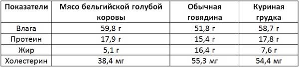 Поживна цінність м’яса блакитних бельгійських корів (її також називають бельгійська «синя яловичина») представлена нижче: