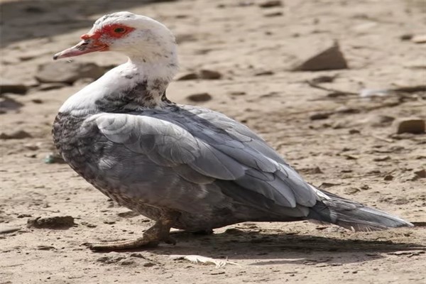 По краях пір’я колір насичений і трохи темніше. Дзьоб сірий з чорними відмітинами і червоними наростами від очей до початку дзьоба, блакитні очі.