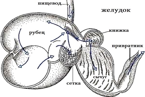 Важливо! Функції у сичуга великі. Його розмір становить близько 14 літрів. Харчової ком, потрапляє в останній відділ шлунка, піддається остаточному перетравленню.