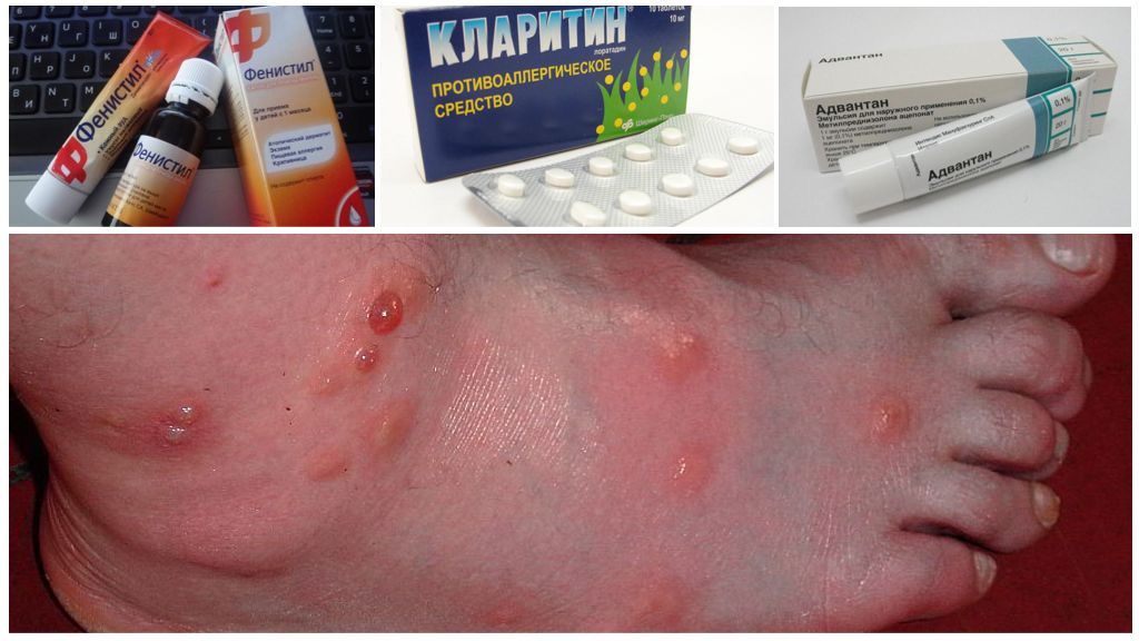 Спочатку рекомендується обробити місця укусів антигістамінним засобом. Активні речовини усувають зовнішні симптоми алергії, пригнічують вироблення гістаміну, тим самим зупиняючи патологічний процес. Одним з найбільш ефективних препаратів є Фенистил гель, який дозволяється використовувати дітям до 1 місяця. Аналогом його є Кларитин.