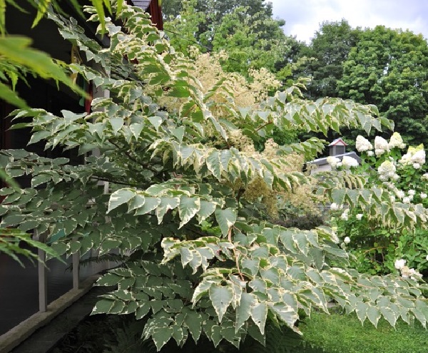 Аралія – це високорослий кущ, що цвіте в липні, серпні і вересні. Розмножується пересаджуванням відростків, які добре приживаються на сонячних місцях дачі. Аралія виростає у висоту від 1,5 до 3 метрів, тому краще висаджувати її по периметру ділянки. Зовні вона нагадує компактну пальму, як видно на фото.