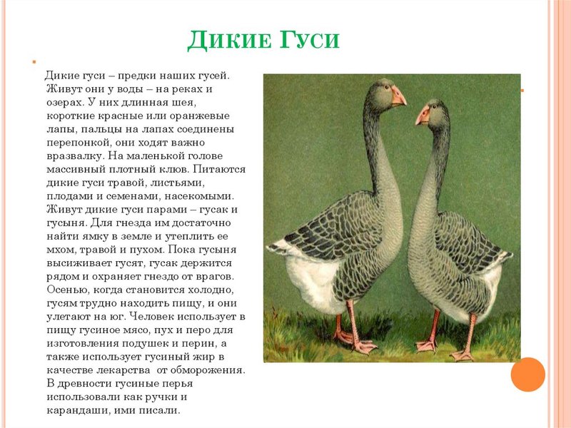 Ці птахи мають перетинчастими лапами, які використовуються для швидкого плавання і для того, щоб пірнати під воду за здобиччю.- Дикі гуси відрізняються красивим і різноманітним пір’ям бурого, сірого, білого і чорного кольорів.