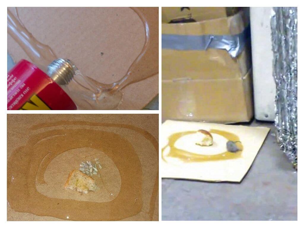 - Клей для мишей. Його можна наносити на будь-які поверхні, що миються (керамічна плитка, скло, пластик та інші різновиди). Перед використанням складу необхідно зробити пробу на невеликій ділянці, щоб перевірити, як він буде змиватися з обраних матеріалів. Щоб не псувати предмети інтер’єру, засобом обмазують картонні смужки або шматки фанери, які після використання необхідно викинути.