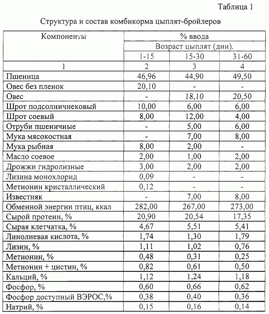 Класичні рецепти кормів для бройлерних курей різного віку наведено в таблиці: