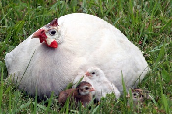 На фото Волзька біла цесарка з пташенятами