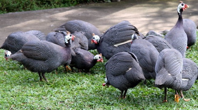 На фото сіро-крапчасті цесарки