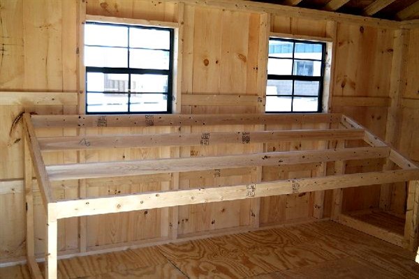 Підлогу обов’язково покривається трав’яним або торф’яним настилом, можна використовувати деревну стружку. Такий варіант облаштування внутрішнього простору буде ідеальний по оптимізації простору. При догляді за птицею немає необхідності заходити в курник. Практично все можна робити, перебуваючи на вулиці.