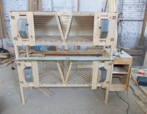 Дерево ошкурівать і шліфують, кінці сітки надійно закріплюють. Гострі краї обов’язково прибирають, щоб живність не поранилася, а виступаючі дерев’яні частини оббивають жерстю. Кролики дуже люблять гризти дерево — так вони сточують зуби. Для цього потрібно підкладати гілочки в їх годівницю. Дах і стіни виготовляють з фанери і сітки, а основним каркасом слугуватимуть дерев’яні бруски. Їх розмір залежатиме від місця розташування конструкції: якщо клітина буде стояти на вулиці, то ніжки каркаса повинні бути від 80 см, а при установці в приміщенні — 35-40 див.
