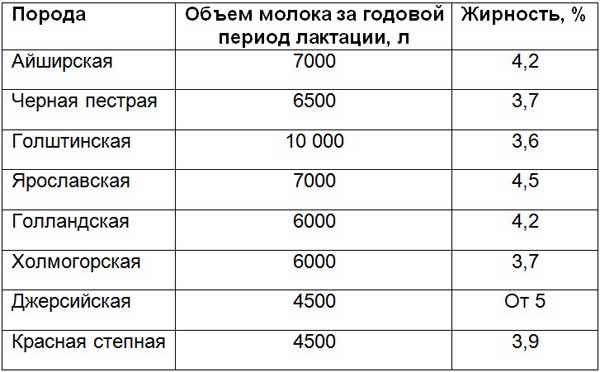 Саме тому фахівці не рекомендують замовляти породистий молодняк на іншому кінці нашої неосяжної батьківщини або за кордоном. А щоб вам було простіше визначитися з тим, які породи і скільки дають молока, ми склали невелику таблицю: