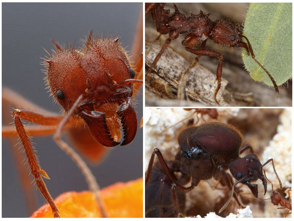 - Набагато крупніше працівників виглядають мурахи захисники або солдати, довжина тіла яких становить 1,5-2 див. Страхітливий вигляд їм надає велика голова з потужними гачкуватими щелепами, завдяки яким комахи зрізають грубу листя тропічних рослин. Адже живуть мурахи листорезы на території Центральної і Південної Америки.