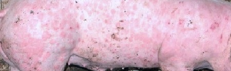 До специфічних симптомів відносять пухлини, водянку, набряк і почервоніння на шкірі, які в першу чергу з’являються на шиї, спині і опускаються на бічні поверхні, як це показано на фото. Надалі розвивається кон’юнктивіт, збільшуються лімфатичні вузли і наростає лихоманка, свиня втрачає вагу. У важких випадках у особин спостерігається блювання і запор.