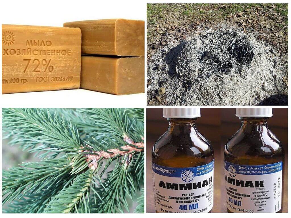 Для приготування розчину знадобиться 2 ст. л. нашатирю, 1 ст. л. рідкого мила (засоби для миття посуду) та 10 л води. Приготовлений розчин застосовують аналогічним способом.