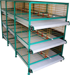 Такі вольєри являють собою велику конструкцію з сітчастим дном. Розмір такого вольєри для птахів 10 повинен бути приблизно 2 на 1,2 м. Піддон треба встановити під кліткою, а по краях споруди — поїлки.