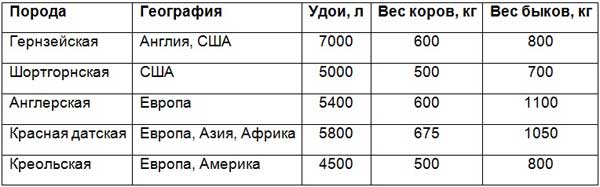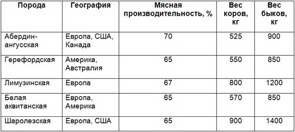Зовсім не обов’язково, щоб у м’ясному напрямку тварину було величезним. Критерії оцінки тут комплексні і фахівці дивляться не стільки на загальний вага, скільки на м’ясну продуктивність і якість яловичини. У нас м’ясних корів почали розводити недавно, і базуються вони переважно в південних регіонах. Основні дані представлені нижче: