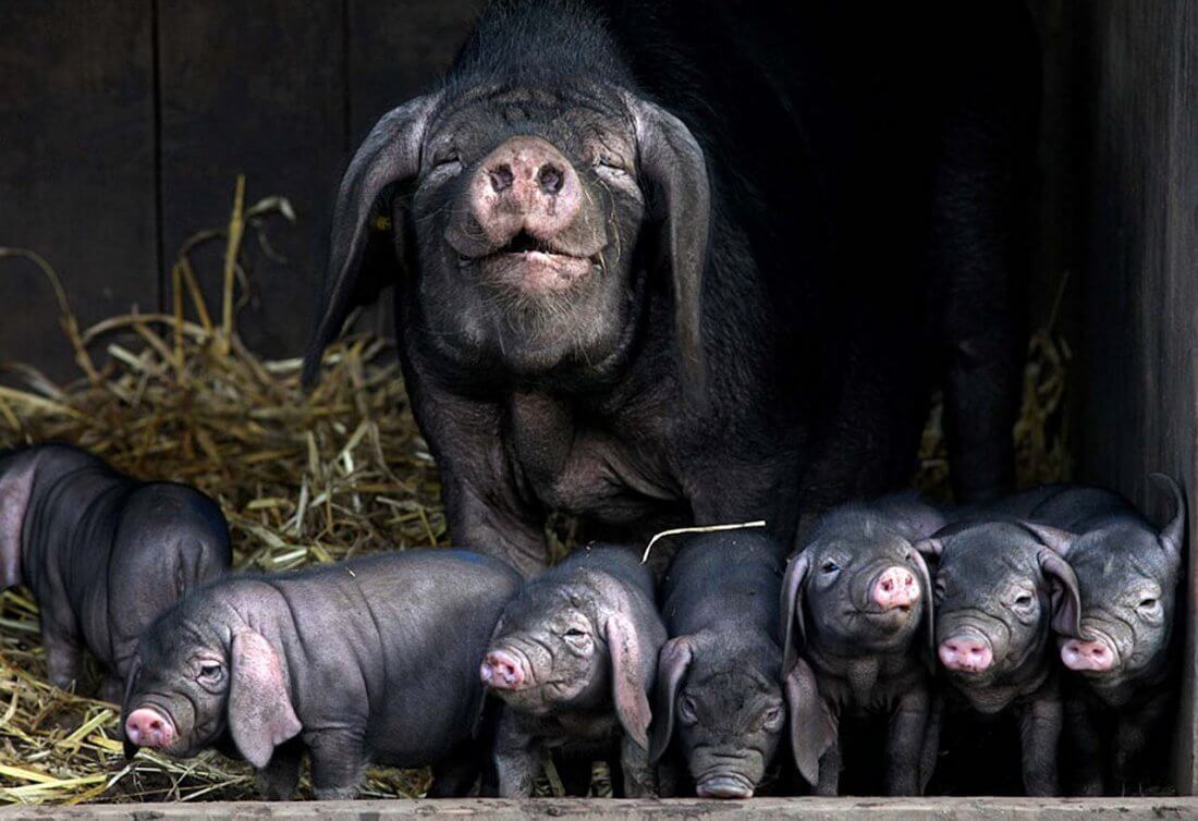 - Догляд за новонародженими поросятами полегшується тим, що свиноматка доглядає за потомством, не потрібно обладнати окремий загін для потомства з обігрівом. Свиня підпускає господаря до дитинчатам, не проявляє агресії.