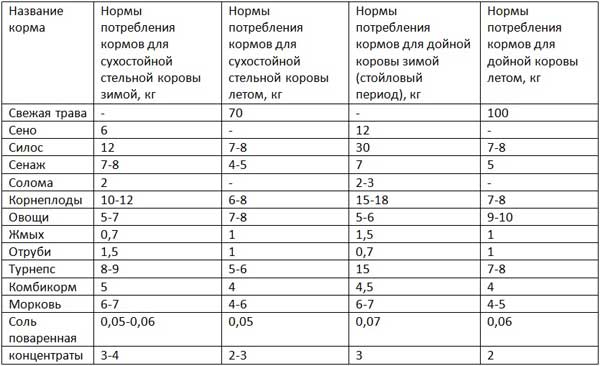 Усереднені дані при складанні примірного раціону годівлі ВРХ молочного напрямку для наочності ми звели в таблицю. Розрахунок потреби в кормах проводився для корови вагою в 500 кг, що дає в рік 12000 л молока. Наведені цифри відповідають нормам на 1 голову і відрізняються в залежності від пори року і стану тварини:
