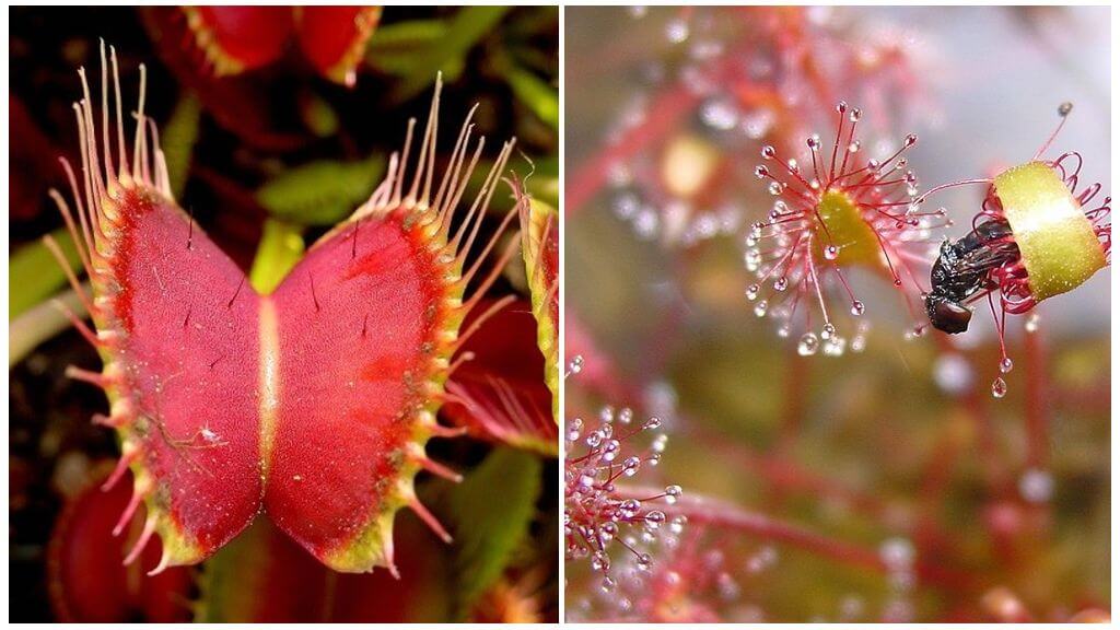 Венерина мухоловка схлопывает дві половинки листа. Росичка обертає лист навколо жертви.