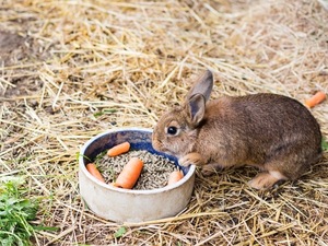 Годувати тварин, які утримуються у вольєрах, стоїть точно такий же їжею, як і тих кроликів, що живуть у клітках. У щоденному раціоні варто поєднувати різну траву (іван-чай, мати-й-мачуху, люцерну), овочі (морква, буряк) та зернові культури (комбікорм, ячмінь, пшеницю, овес). Також харчування звіряток бажано доповнювати кухонною сіллю і кісткової борошном. Якщо ви хочете уникнути тотального знищення деревної частини вольєра, то обов’язково давайте кроликам трохи гілочок. Дуже важливо стежити за тим, щоб поїлки були наповнені чистою водою.