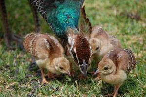 Пташенятам дають таку саму їжу, як і дорослим павичам. В їх їжу потрібно додавати і інші продукти: