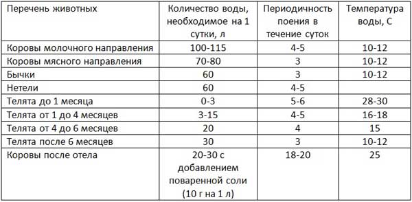 Норми випивається протягом дня рідини для кожної індивідуальної особи, навіть якщо корови одного віку і породи, можуть відрізнятися. Так, для молочних корів в середньому потрібно 5 л на 1 кг корму. Тобто, якщо добова норма грубих кормів становить 8 кг, то потрібно 40 л води. Дана кількість дасть можливість отримувати до 40 л молока.