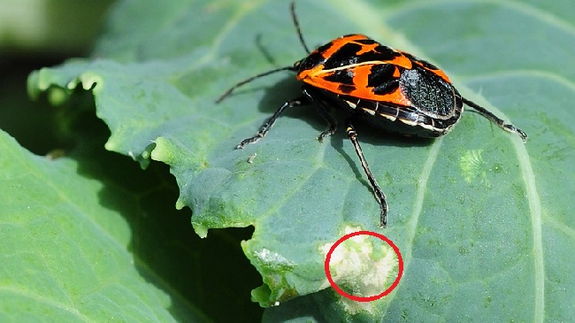 На фото капустяний клоп і освітлений ділянку ураженого листа