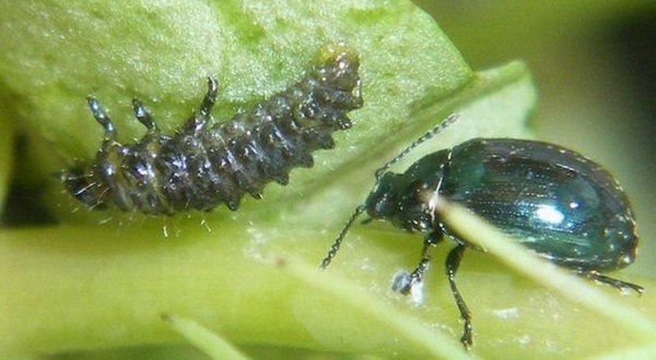 На фото жук-капустяний листоїд і його личинка