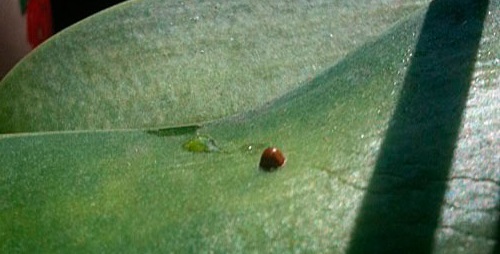 Як видно на фото, щитівка ховається в маленьких коричневих горбках, які можуть бути хаотично прикріплені на будь-якій ділянці листа. Це самка щитової попелиці, виробивши речовина, яка нагадує віск, відклала яйця. Під 1 воскової плівкою може перебувати близько 3 тисяч яєць. Наріст можна відколупнути від листа і побачити із зворотного боку щитовку.