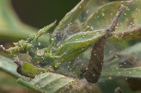 Павутинний кліщ – небезпечна комаха, висмоктує живильний сік рослини. Живе під листям, на яких в результаті численних укусів з’являються світлі крапки. Надалі точки темніють, уражену ділянку листа засихає. При масовому ураженні павутинний кліщ викликає загибель зав’язі і плодів. Якщо не вжити заходів боротьби, то рослина загине.