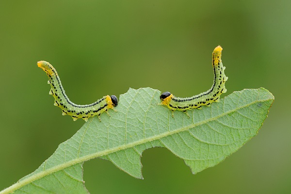 Помітити личинки не складно. Це світло-зелені гусениці, з маленькими чорними точками на тілі. Вони дуже ненажерливі, завдяки чому ростуть прямо на очах, збільшуючись в розмірах з кожним днем. Переживають зиму личинки у верхніх шарах грунту прямо під кущем. При появі першого тепла вони заляльковуються і до того часу, як на чагарнику зростуть перші листи з лялечки утворюється мушка з жовтим тілом, прозорими крилами, як це видно на фото.