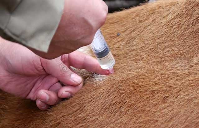 Другий метод введення вакцини – внутрішньошкірної. При цьому методі великій рогатій худобі вводять 2 куб. см препарату в область промежини, де не росте шерсть.