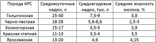 Первістка дає до 10 л на день, а надої у більш дорослих особин можуть досягати 25-40 л. Молочна продуктивність корів залежить від породи великої рогатої худоби, які в залежності від цілей змісту поділяються на: молочні, м’ясні, м’ясо-молочні.