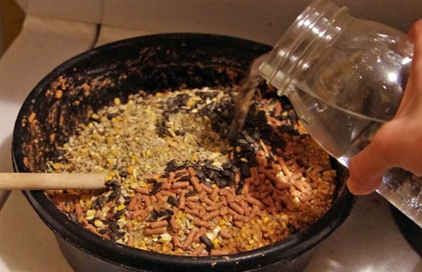 Інгредієнти подрібнюються і змішуються. На виробництві це робить спеціальна машина, в домашніх умовах, доведеться шукати альтернативні методи. Далі майбутній комбікорм потрібно заварювати. Для цього, вся дробленка заливають кип’яченою водою і настоюється 5-8 годин. Домашній комбікорм вийшов ароматним і містить великий список поживний і корисних речовин.