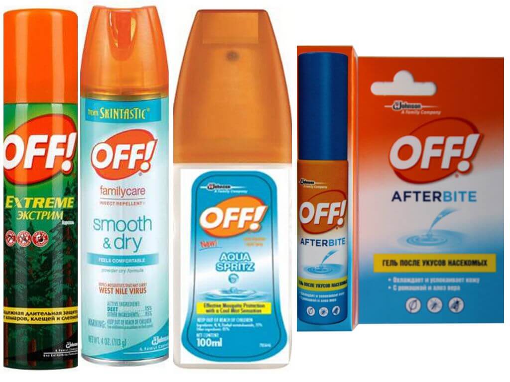 Бренд Офф відомий по всьому світу, пропонує безліч препаратів від комарів в різній формі. Особливою популярністю користується спрей, аерозоль. Засоби відрізняються між собою концентрацією активного компонента.