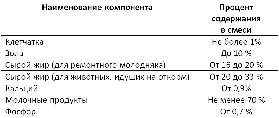 Якщо ви вирішили випоювати телят сухою сумішшю, то вам необхідно розібратися з тим, як правильно її вибрати. Перед покупкою ЗЦМ, треба вивчити склад, зазначений на етикетці. Перелік компонентів, що характеризують якісну суміш, і рівень їх вмісту в сухому молоці, наведені в таблиці: