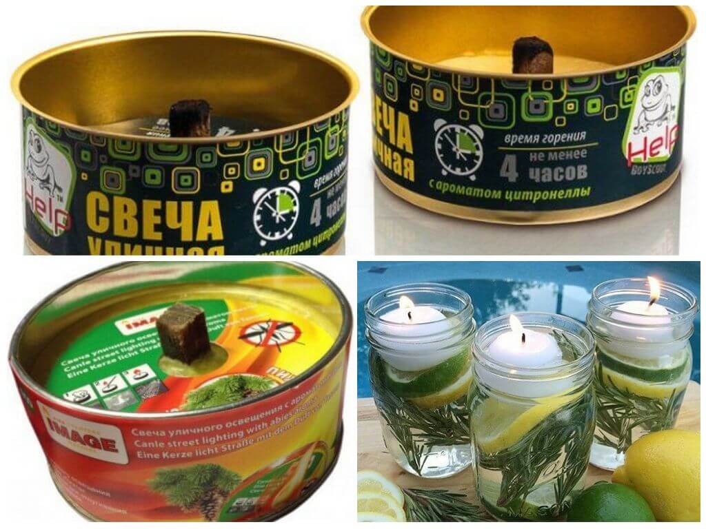 Не бажаючи витрачатися на покупні репеленти, виготовити їх можна і самостійно. Як зробити свічки своїми руками? Та дуже просто. Для їх приготування знадобиться лимон, лайм, квіти і трави. Нарізані часточки цитрусових і елементи рослин укладають в скляну ємність, після чого її до половини, заливають водою і додають 7-10 крапель ефірного масла цітронелли. Потім ємність заповнюють водою доверху, акуратно поміщаючи в неї свічку. Виходить дуже красивий і ароматний репелент, до того ж дуже корисний для здоров’я.