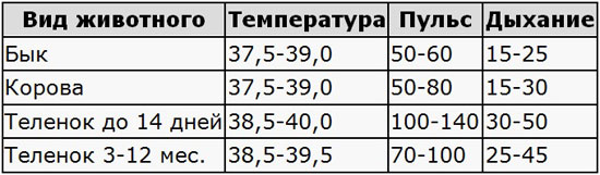 Співвідношення температури, пульсу і дихання у великої рогатої худоби трохи розрізняється для дорослих тварин і молодняку. Нормальні фізіологічні показники наведені в таблиці.
